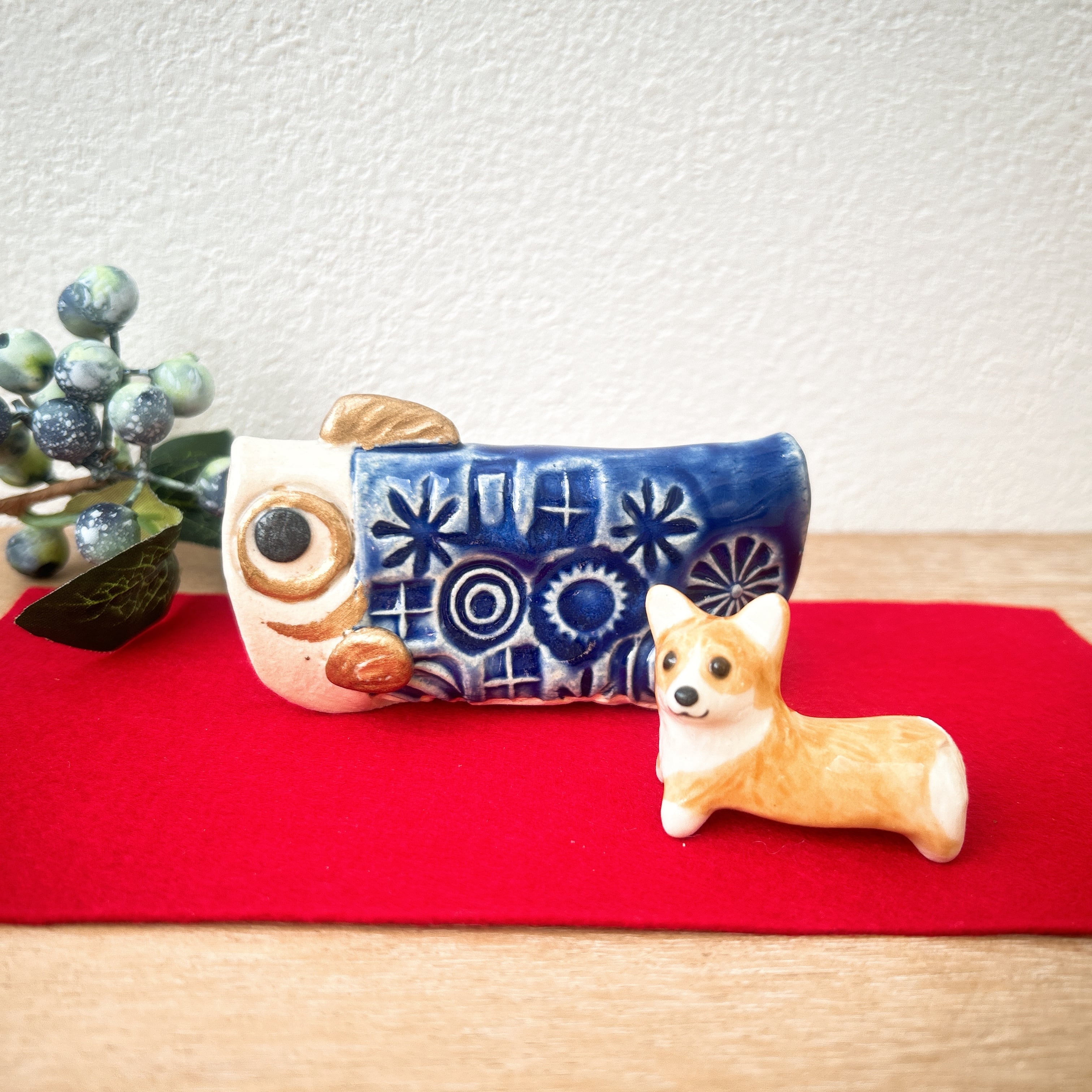 コーギー犬さんと陶器の鯉のぼりセット。